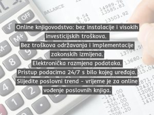 Ugovaranjem naših usluga svojim korisnicima pružamo mogućnost korištenja online knjigovodstvenog programa putem e-računa sa bilo koje lokacije u bilo koje vrijeme te omogućava poduzetnicima slobodu poslovanja uz stalni uvid u poslovanje poduzeća ili poslovnica; bez fizičke prisutnosti. Naše knjigovodstvo nudi jedinstveno rješenje za svakog poduzetnika ujedno smanjujući troškove poslovanja jer ugovaranjem računovodstvenih i knjigovodstvenih usluga na korištenje možete dobiti knjigovodstveni program za maloprodaju, veleprodaju, skladišta te sve segmente za uspješno poslovanje Vaše tvrtke.